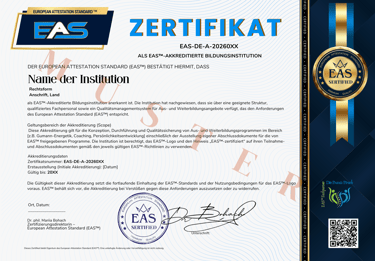 Es zeigt, dass ein Kurs, ein Programm oder eine Plattform nach dem European Attestation Standard (EAS) geprüft wurde – einem an internationalen ISO‑Normen orientierten Qualitätsstandard für Online‑Bildung und Human‑Energetik.