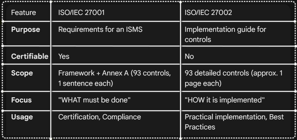 Both standards are used together: ISO/IEC 27001 provides the structure, while ISO/IEC 27002 provides the details.