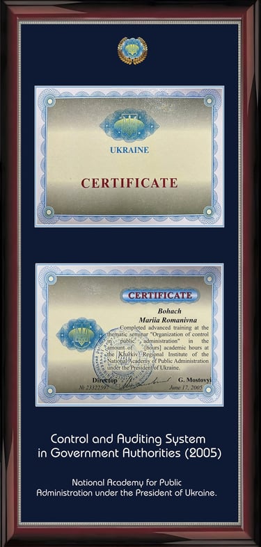 For her significant personal contribution to state-building and high professionalism, she was honored with an official Commendation from the President of Ukraine and government-level awards. Deep knowledge of audit processes, documentation standards, and legal liability issues, obtained "firsthand," forms the professional, ethical, and methodological basis of the EAS™ standard.