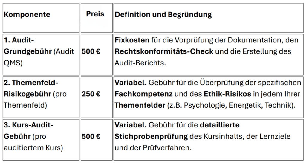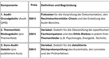 Gesamtkosten = 500 € (Audit-Grundgebühr) + (Anzahl Themenfelder × 250 €) + (Anzahl auditierter Kurse × 500 €)