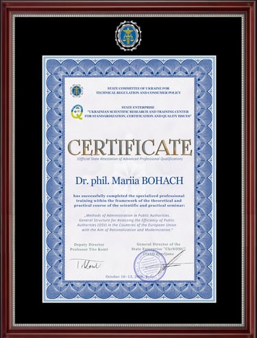 CASO ESPERTO: Il processo di formazione ha incluso un'elaborazione approfondita degli algoritmi per valutare l'efficienza delle prestazioni delle autorità governative. La conferma legale dell'ottenimento di una competenza professionale di livello mondiale è stata il contratto di servizi di consulenza con il Centro Statale di Ricerca (UkrNDNC), che ha legittimato l'implementazione di questi metodi nella regione.