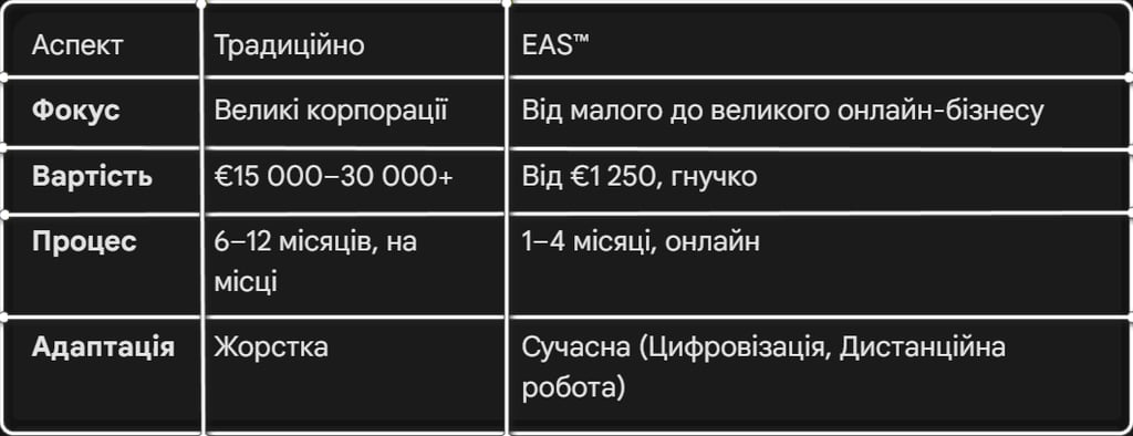 Завдяки чітким критеріям, прозорим процедурам аудиту та зрозумілим документам EAS™ легко впроваджується там, де класичні моделі сертифікації вже не працюють.